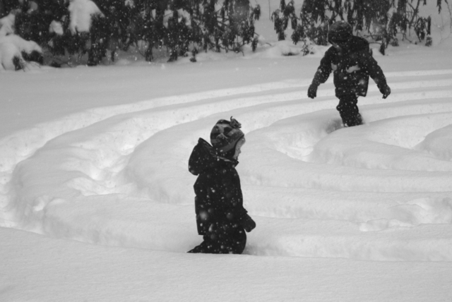 A couple of weeks back, my boys were running through this year’s spiral. We had recently gotten nearly three feet of snow in a storm, so it was tough going even though I had made the path smooth with snowshoes. The boys kept tripping and falling, laughing and shouting.